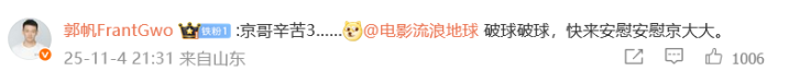 导演郭帆留言安慰:“京哥辛苦3……@电影流浪地球破球破球,快来安慰安慰京大大。”